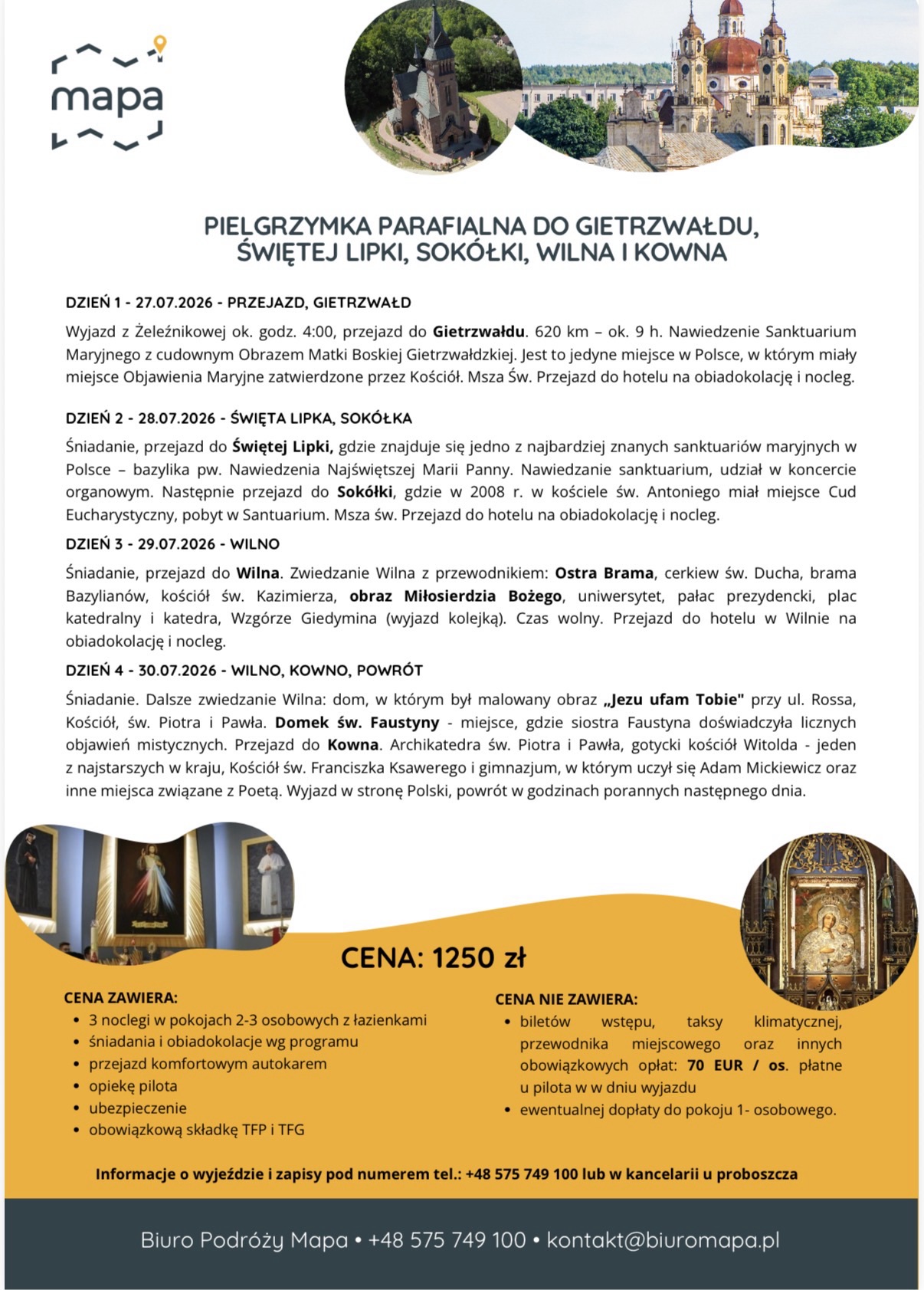 – zapraszamy do zapisów na międzyparafialną czterodniową pielgrzymkę autokarową do: GIETRZWAŁDU, ŚWIĘTEJ LIPKI, SOKÓŁKI, WILNA /Ostra Brama/ i KOWNA, w dniach od 27 do 30 lipca. Zapisów dokonujemy u księży w kancelarii parafialnej do niedzieli, 3 maja; pierwsza wpłata (450zł) przy zapisie, druga wpłata (800zł) do dn. 15-06-2026 i 70 EUR płatne u pilota w dniu wyjazdu pielgrzymki. Szczegóły na plakacie w gablotach ogłoszeń i na stronie internetowej naszej parafii